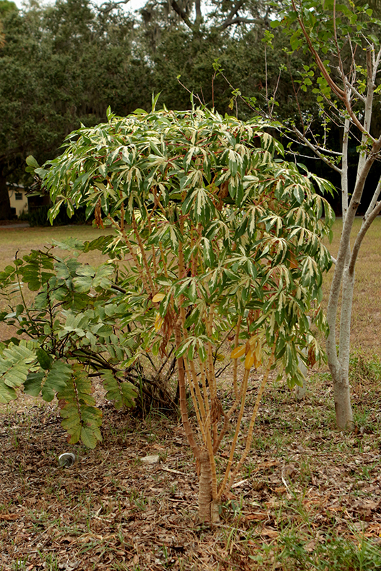 Variegated Tapioca will grow to be about 10 feet tall at maturity, with a spread of 10 feet. It has a low canopy with a typical clearance of 1 foot from the ground. Although it's not a true annual, this fast-growing plant can be expected to behave as an annual in our climate if left outdoors over the winter, usually needing replacement the following year. As such, gardeners should take into consideration that it will perform differently than it would in its native habitat.