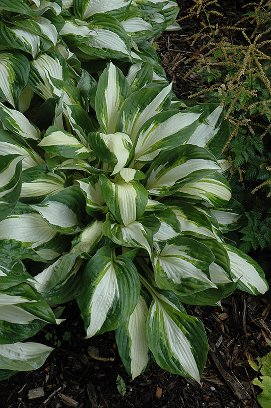 Vulcan Hosta features dainty spikes of lavender tubular flowers rising above the foliage from mid to late summer. Its attractive textured pointy leaves remain white in color with distinctive bluish-green edges and tinges of chartreuse throughout the season.