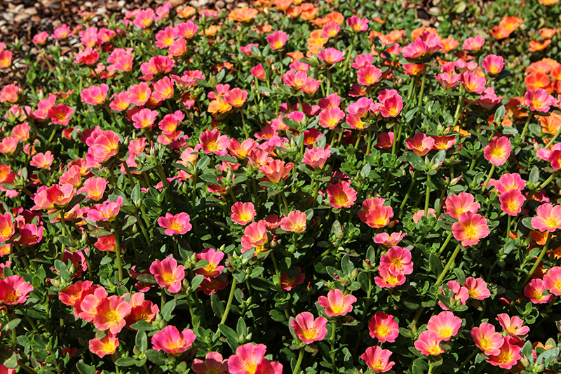 Mojave® Pink Portulaca will grow to be only 6 inches tall at maturity, with a spread of 16 inches. When grown in masses or used as a bedding plant, individual plants should be spaced approximately 12 inches apart. Its foliage tends to remain low and dense right to the ground. This fast-growing annual will normally live for one full growing season, needing replacement the following year.
