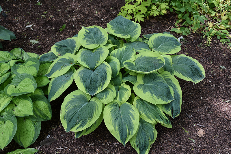A wonderful slug resistant variety featuring large mounds of blue-green foliage with wide golden yellow margins; leaves are thick and heavily corrugated; near white flowers appear on tall scapes during the summer months; adds color, contrast and texture