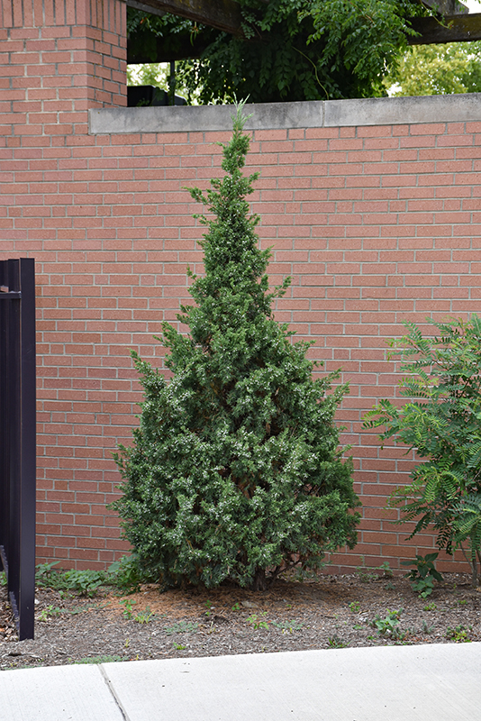 A tall evergreen shrub with a narrow pyramidal habit of growth; sharp needle-like bright green foliage and abundant bluish-green berries, great for changing up the skyline in the home landscape, makes a great tall evergreen hedge; best in full sun